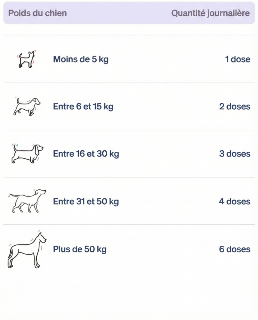 Pour une posologie précise et adaptée aux besoins de votre chien, référez-vous au tableau ci-dessous.